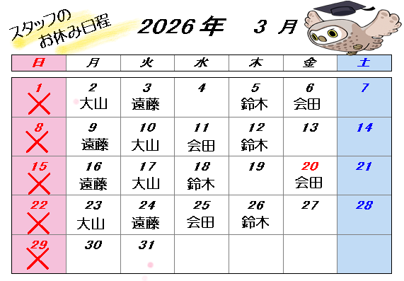 3月のスタッフのお休みは下記の日程になります。